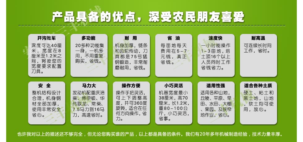 公司生產(chǎn)的微耕機品質(zhì)好、質(zhì)量用,機身一次沖壓成型;擁有一臺機器即等于免費擁有了10名工人